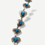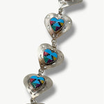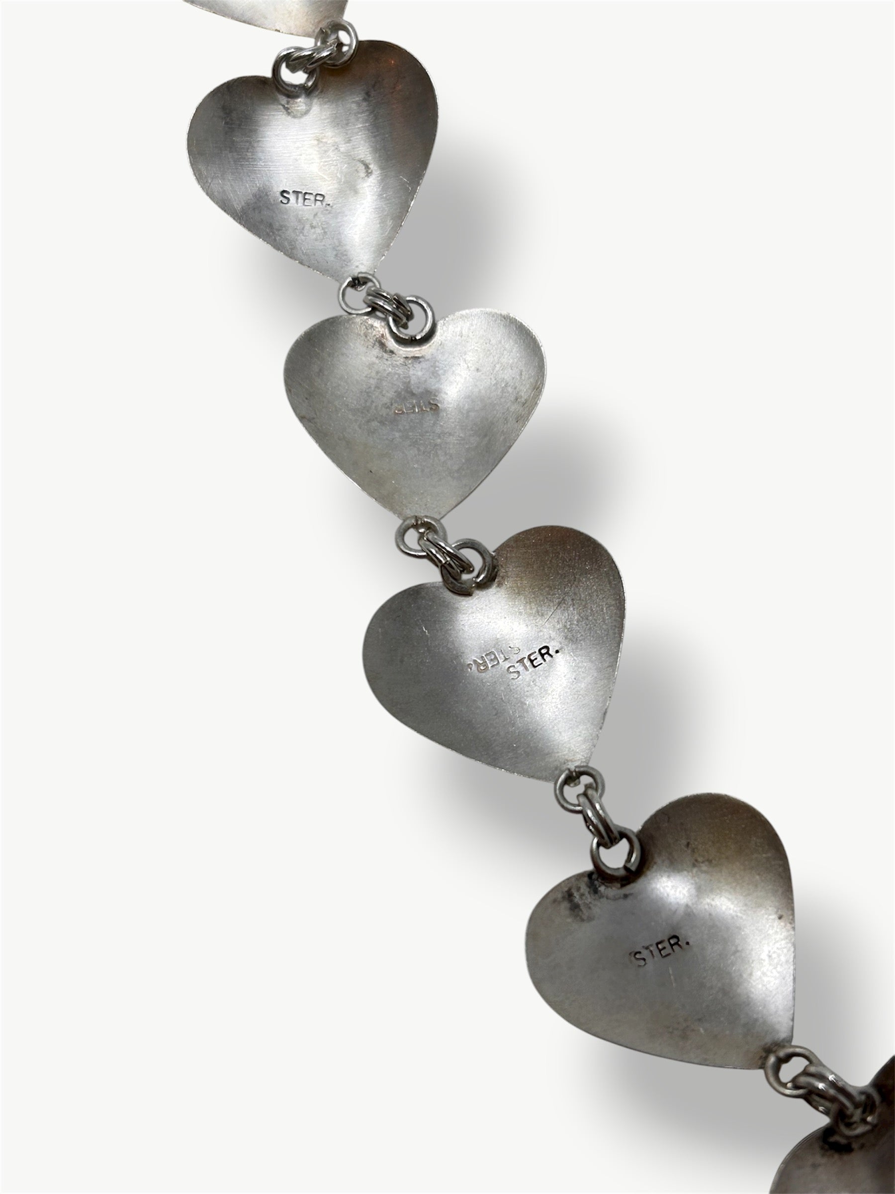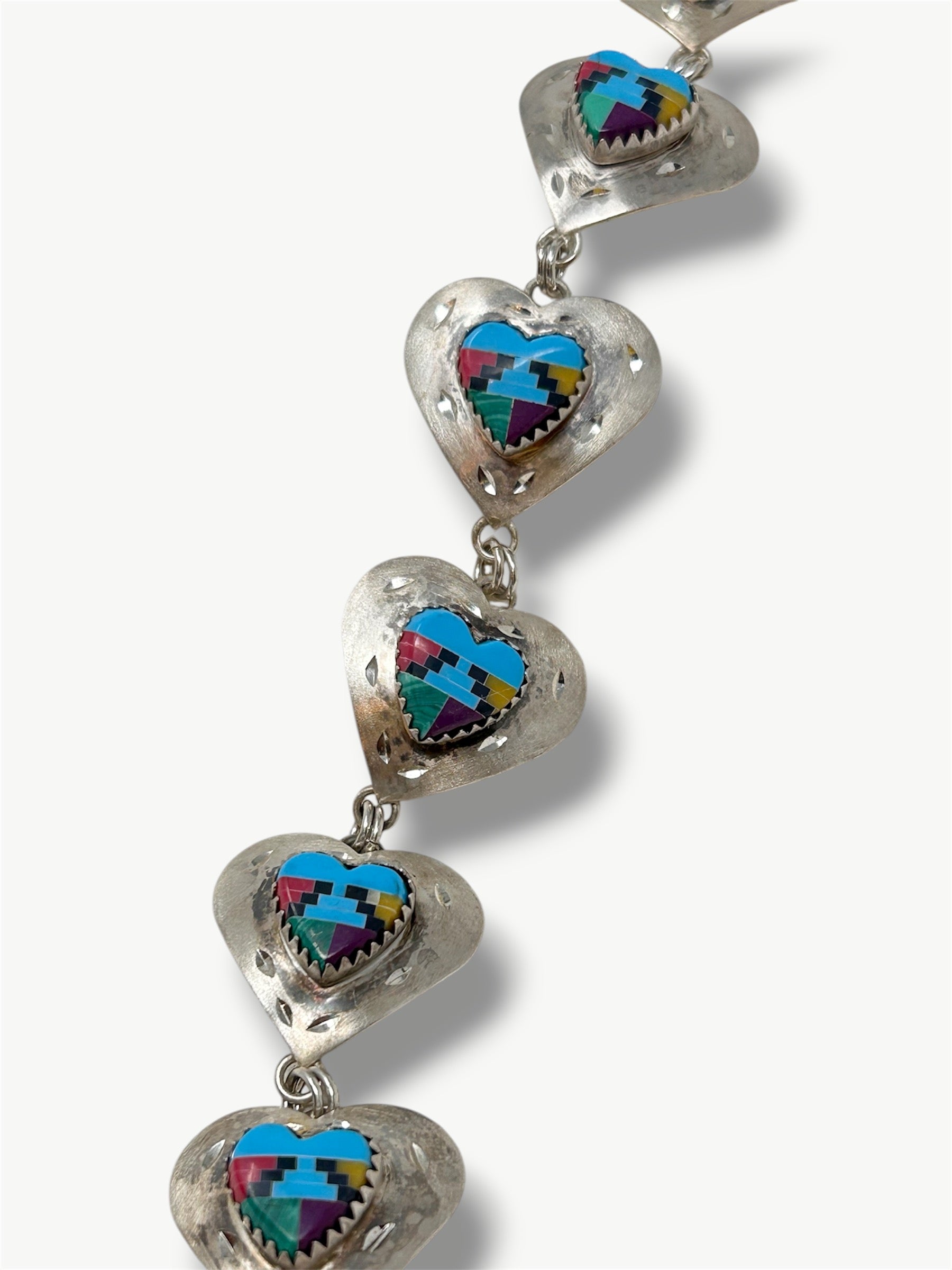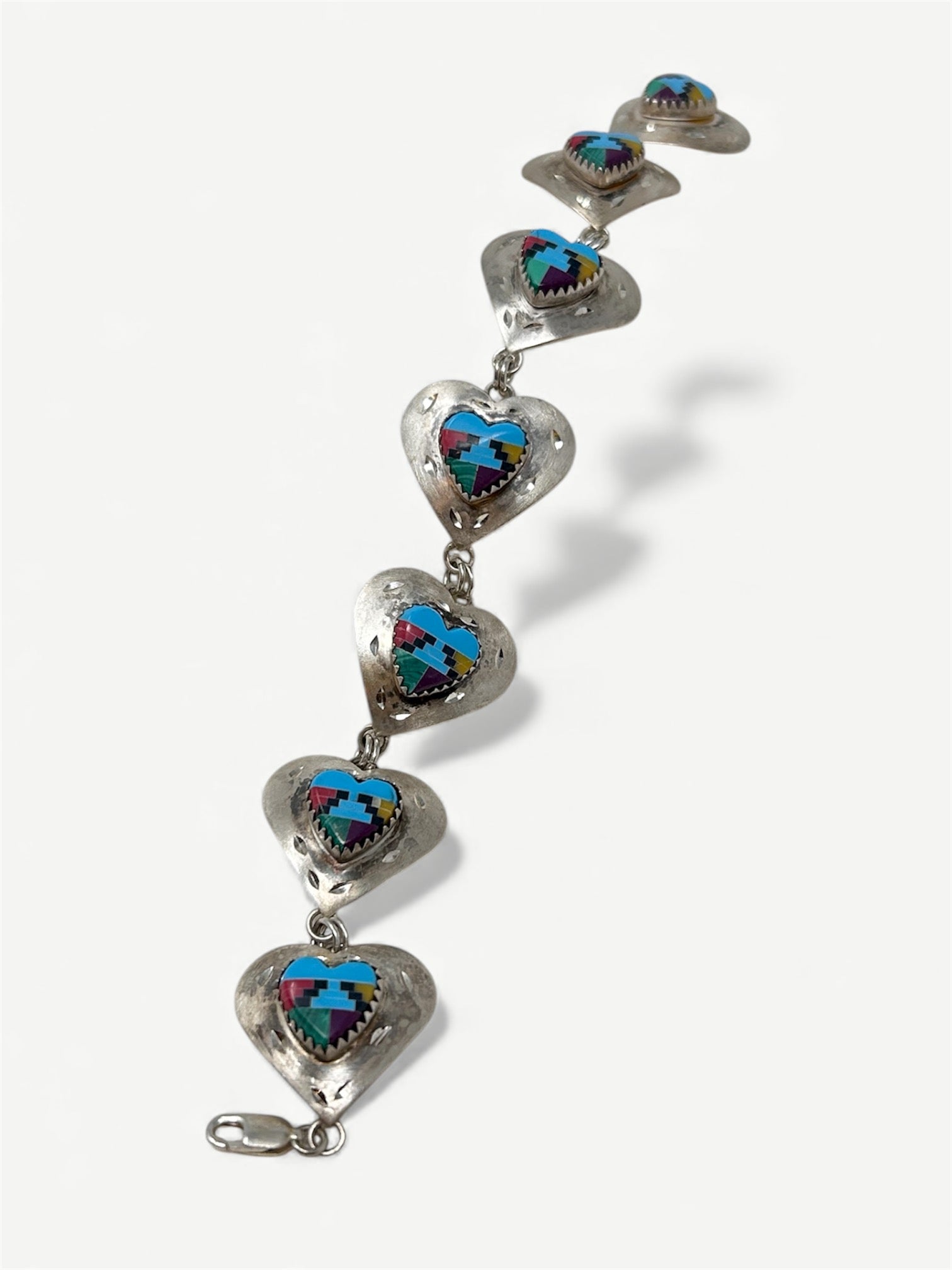 One of one, from the in store collection. This vintage love heart bracelet measures 7.25 inches and is sterling with mixed gem stones.