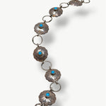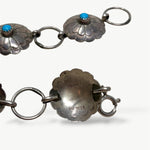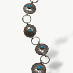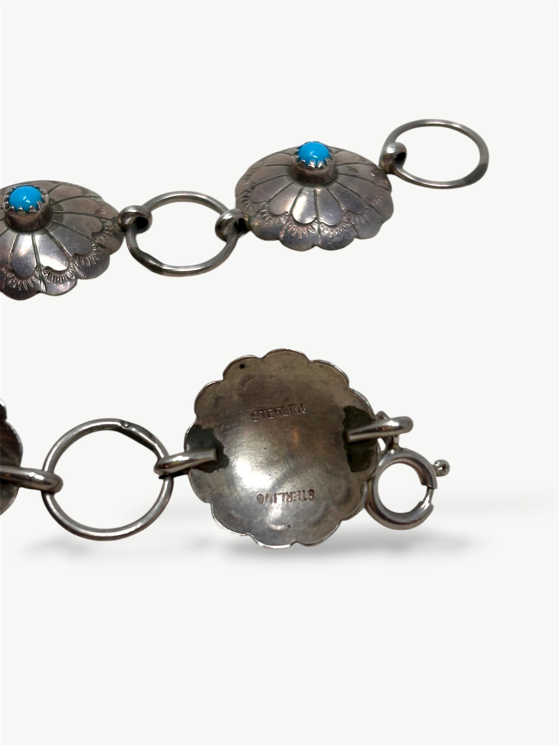 One of one, from the in store collection. This vintage turquoise bracelet measures 8.25 inches and is sterling with mixed gem stones.