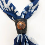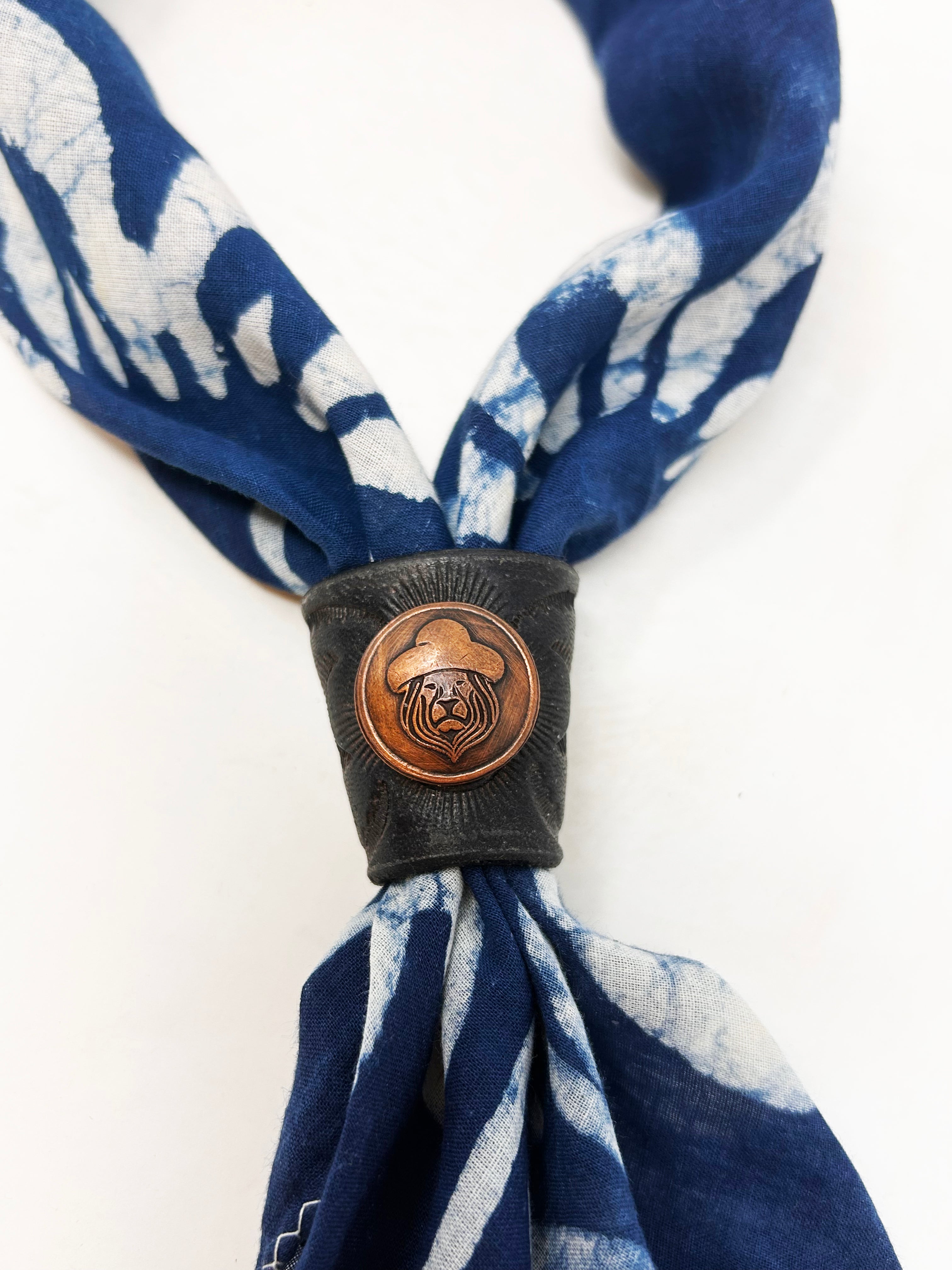 Each Busto Bandana Slider is a singular piece—handmade from rich leather and embellished with vintage coins, stones, and unique hardware. Designed to hold your bandana in place with effortless style, they bring a rugged refinement to any look. No two are alike. From turquoise accents to antique brass and hand-etched details, every slider tells its own story. Crafted in the spirit of heritage, individuality, and the open road.