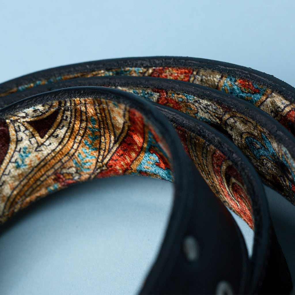 Crafted in jet black leather and finished with solid brass hardware, this belt is a study in quiet luxury. Lined with an unexpected patterned textile, it offers a subtle flash of character—like a tailored suit with a bold lining, meant to be discovered. Built to wear beautifully over time, this piece holds its own whether you’re dressing up denim or cinching a tailored trouser.