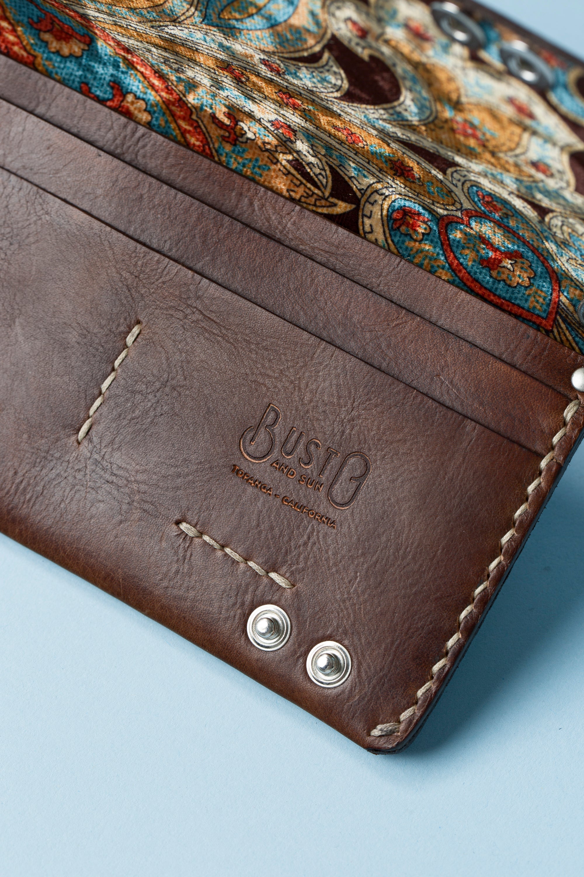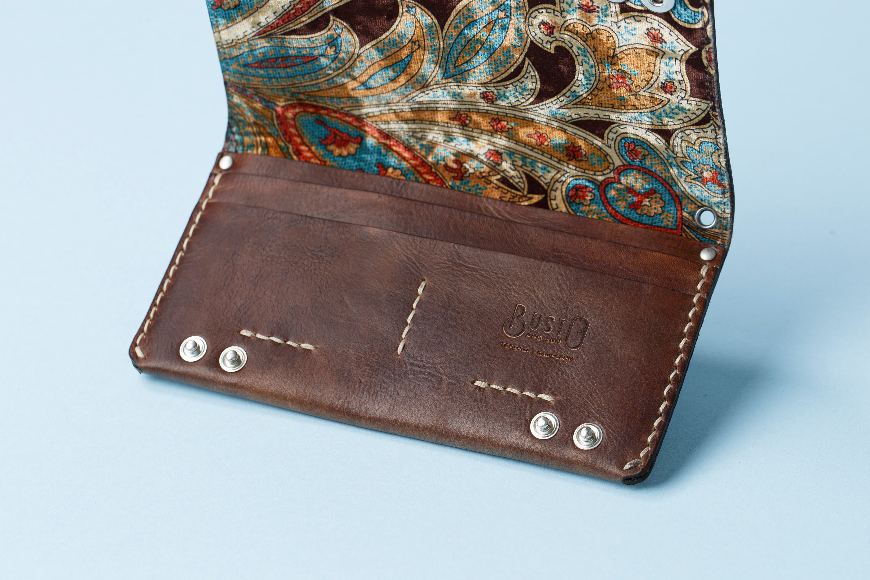 Slim, strong, and built to last—The Western Ledger is a refined companion for those who carry stories as well as currency. Crafted from richly grained leather and secured with aged metal rivets, it opens to reveal a velvet-patterned lining with just the right amount of drama. Big enough to hold bills, cards, and ID—small enough to slip into a jacket pocket.