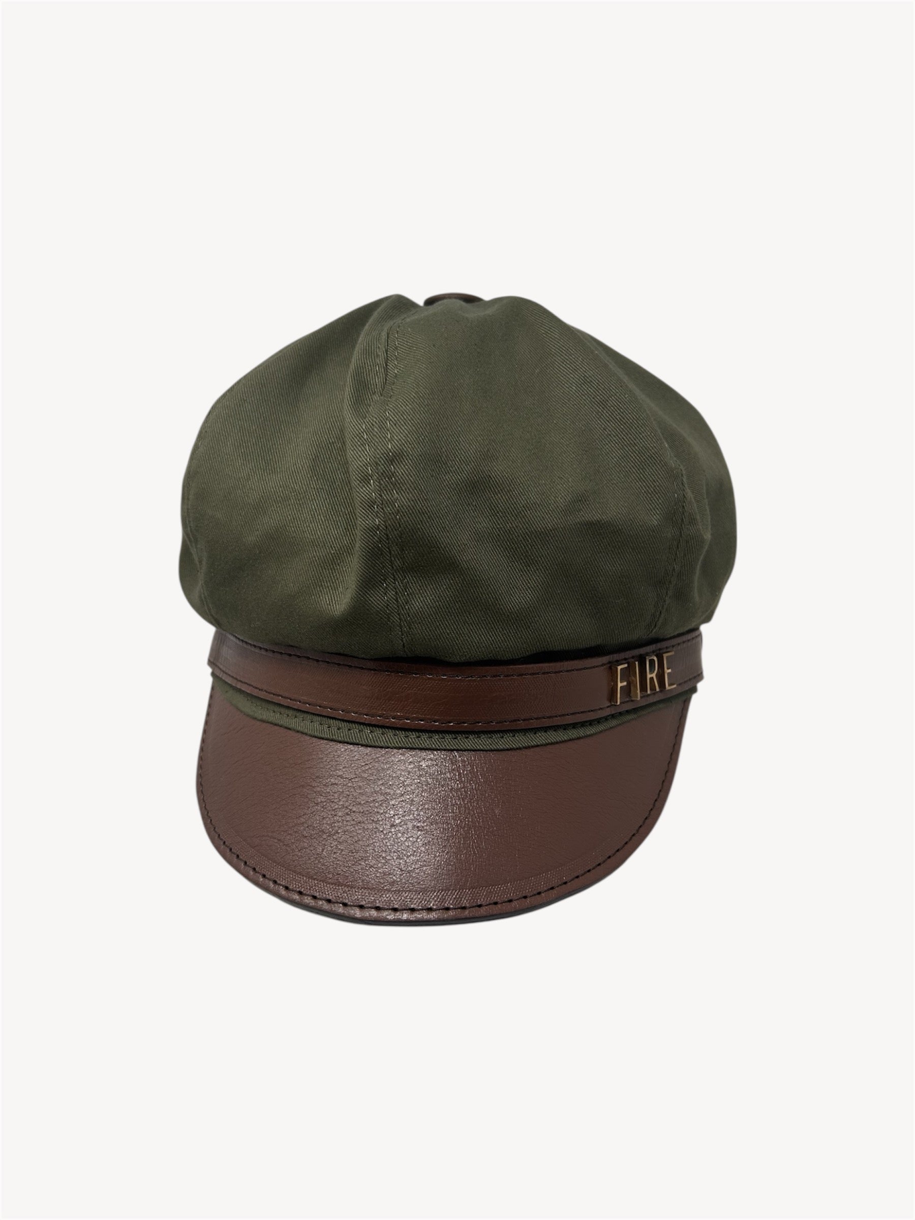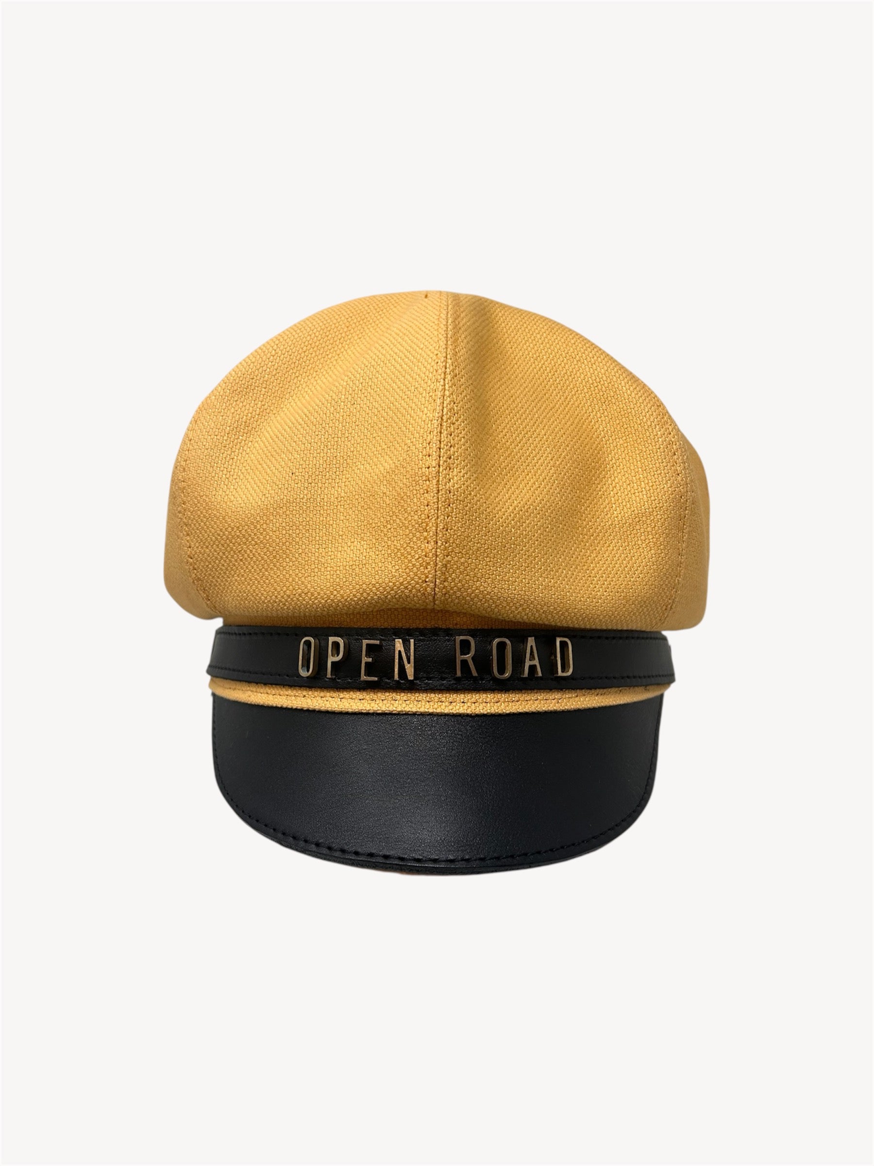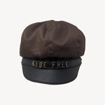 Crafted from heavyweight cotton canvas and trimmed in smooth leather, the hat balances grit and refinement. Across the back, a bold arc of individually hand-cast brass letters makes this piece unmistakably one-of-one. The shape nods to workwear tradition and post-war American rebellion—built for the ones who never needed permission.